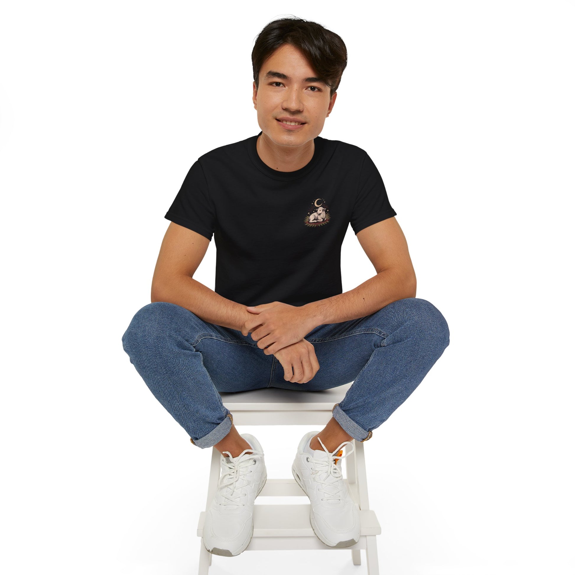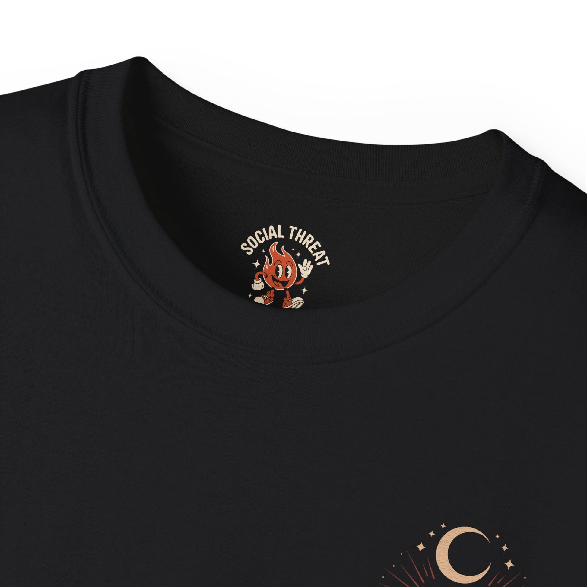 On the front chest, a small lamb rests quietly beneath a crescent moon. The word Social Threat is woven subtly into the artwork. This image reflects Luke 15, the parable of the lost sheep, reminding us that even the one is worth seeking. It’s a quiet emblem of protection, innocence, and heaven’s concern for every soul.
